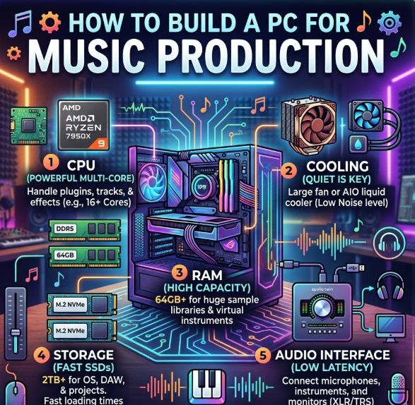 Music production PCs require stability, low latency, and high processing power.