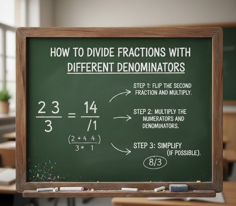 Dividing fractions with different denominators often worries students, but it is actually easier than adding or subtracting fractions.