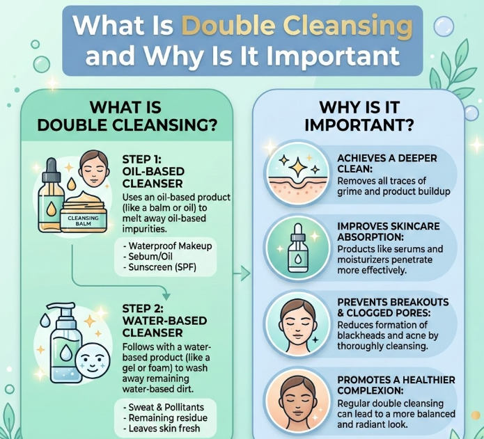 Double cleansing is a two-step facial cleansing method that uses an oil-based cleanser first, followed by a water-based cleanser. The first step dissolves oil-based impurities like makeup and sunscreen, while the second step removes sweat, dirt, and environmental debris.