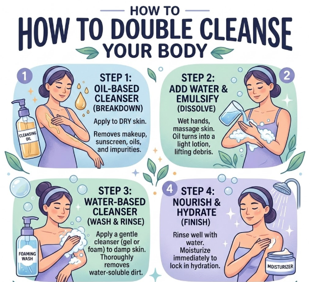 Body skin also benefits from layered cleansing, especially after sunscreen or workouts.