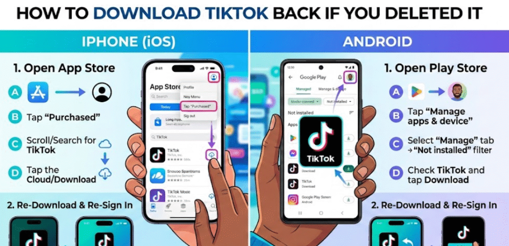 Many users accidentally uninstall TikTok or delete it to take a break from social media. Reinstallation depends on whether only the app was removed or the account was permanently deleted.