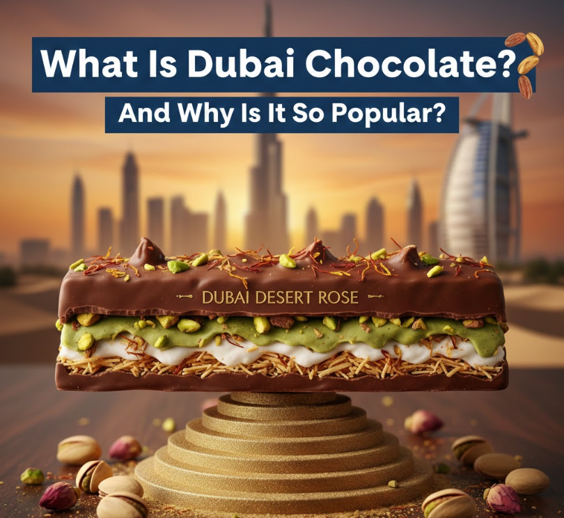 Dubai chocolate is a luxury-style chocolate dessert known for its thick chocolate shells, creamy pistachio or hazelnut fillings, crispy kunafa texture, and premium presentation. It blends European chocolate-making techniques with Middle Eastern dessert culture.