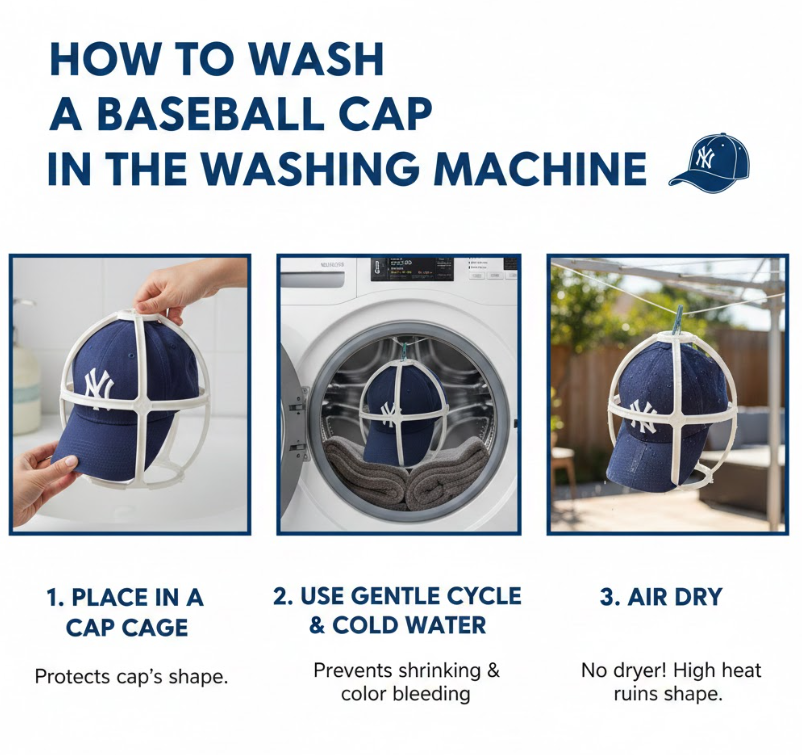 Using a mesh laundry bag or hat cage prevents the cap from being crushed or twisted. This protection preserves stitching and brim shape.